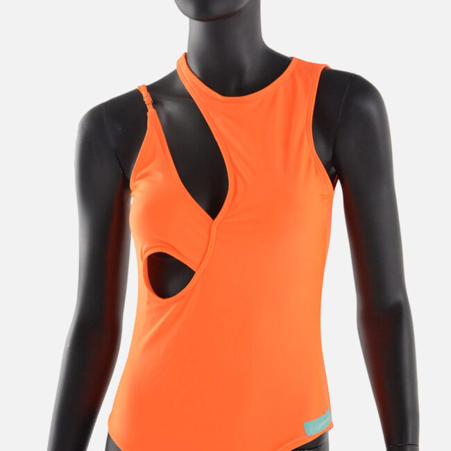Kualitet i lartë, rrobabanjo trup me një lidhje në qafë dhe një në shpatull. Ngjyra neoni shumë tërheqëse.