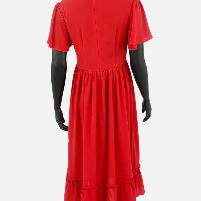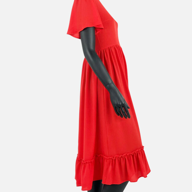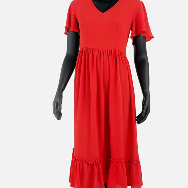 Kualitet i lartë, fustan i derdhur me jakë ‘V’ dhe me fund të lirshëm,dhe me fruda në fund, që e bën më elegant.