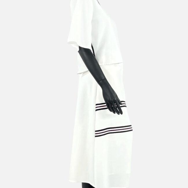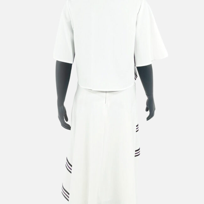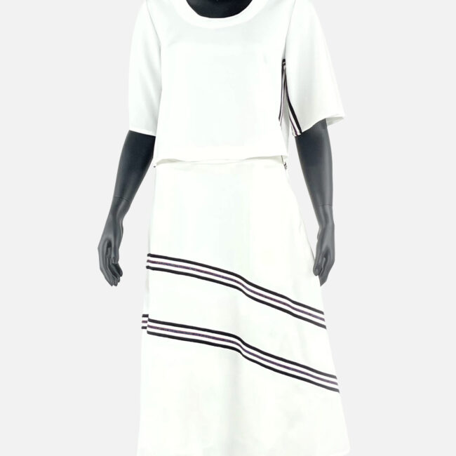 Kualitet i lartë, set fund dhe bluzë e lirshme. Bluza është me jakë rrumbullake, fundi me bel të lartë me dy xhepa anash, gjatësia poshtë gjurit.